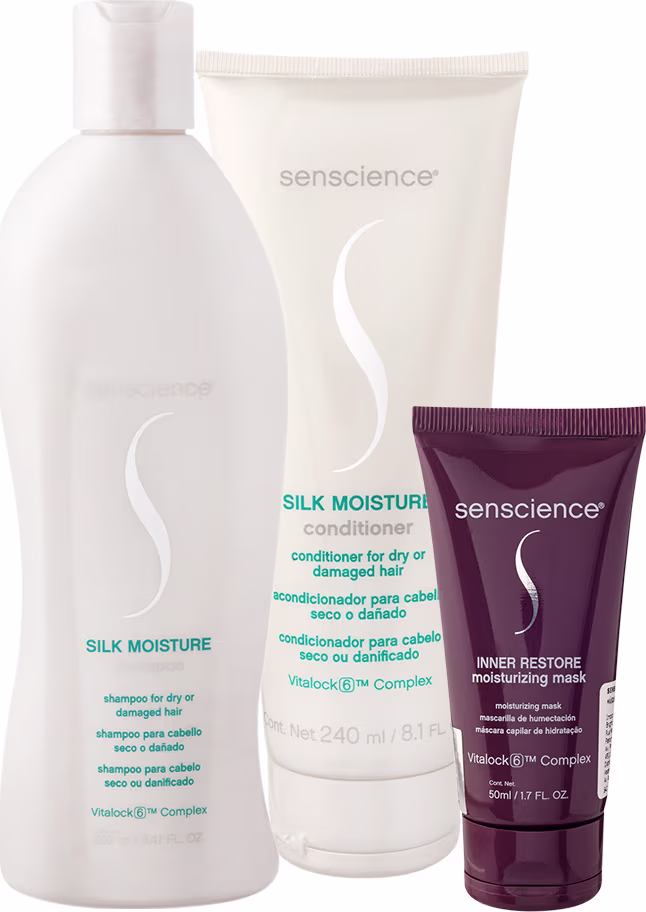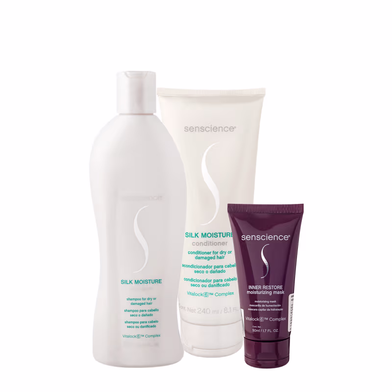 Senscience Silk Moisture Conditioner - Condicionador 240ml: para cabelos secos e danificados. Desembaraça e condiciona, hidratando os fios. Ele fortalece a fibra capilar e deixa o cabelo com uma maciez incrível.