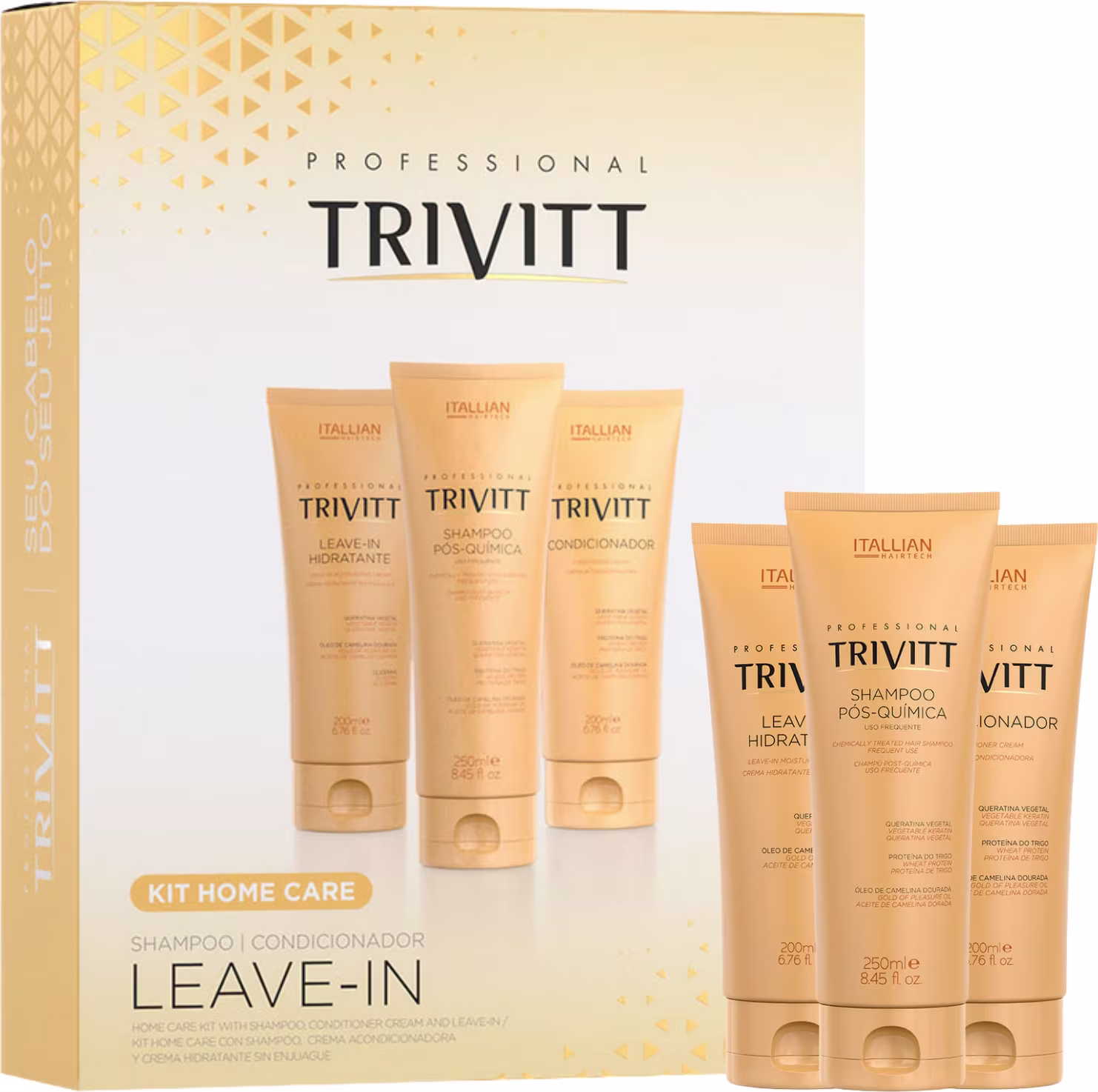 O kit Itallian Trivitt Home Care com Leave-in Hidratante oferece hidratação intensa, maciez e resistência ao cabelo quimicamente tratado. Contém shampoo pós-química, condicionador Trivitt e leave-in hidratante. Os ativos incluem proteína do trigo, queratina, óleo de camelina dourada e filtro solar. O modo de uso inclui aplicar o shampoo, condicionador e leave-in nos cabelos úmidos e limpos. O leave-in pode ser usado em cabelos secos em menor quantidade.
