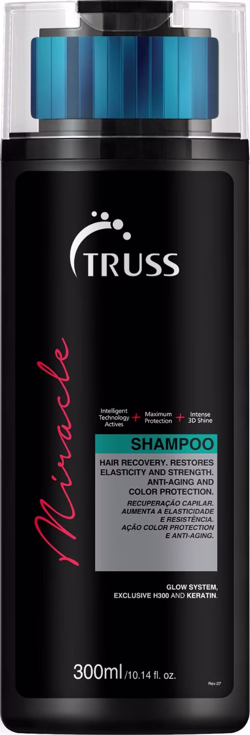 O Shampoo TRUSS MIRACLE oferece limpeza suave e reconstrução intensa para todos os tipos de cabelo, reparando danos causados pelo tempo e pela química, com brilho 3D e maciez. Contém queratina, que aumenta a resistência, hidratação e elasticidade dos fios. Seus resultados são visíveis desde a primeira aplicação e melhoram com o uso de outros produtos da linha. É Cruelty Free e inclui ativos que melhoram a penteabilidade, promovem brilho e protegem a cor. Para usar, aplique no cabelo úmido, massageie, deixe agir por 2 minutos e enxágue. Evite contato com os olhos, não use em couro cabeludo irritado e mantenha fora do alcance de crianças. Dermatologicamente testado.