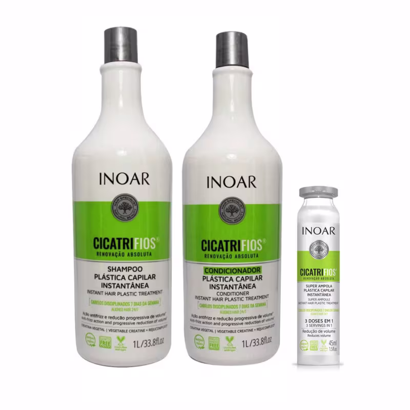 Todos os benefícios da plástica capilar para a renovação absoluta dos fios. CicatriFios é a evolução em tratamento que oferece inúmeros benefícios para um cabelo absolutamente renovado, todos os dias. Sua fórmula, enriquecida com RejuComplex3, renova, amacia, reduz quebra e frizz e oferece redução progressiva de volume, para um cabelo selado, com brilho extremo, fácil escovação e efeitos duradouros. Para prolongar os efeitos dos tratamentos químicos, temos o CicatriFios Pós-Química. Sua fórmula altamente hidratante e reconstrutora mantém o efeito de coloração, redução de volume, descoloração e outros tratamentos capilares, para que durem muito mais. Completando a linha, o CicatriFios Botânico & Vegano tem formulação natural, sem ingredientes de origem animal, e oferece inúmeros benefícios para um cabelo absolutamente renovado, todos os dias.
