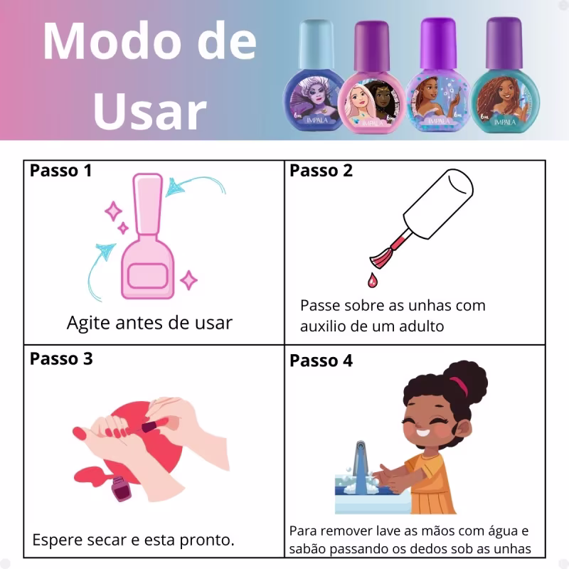 Além disso, sua fácil remoção com água e sabão faz com que a brincadeira seja ainda mais prática, evitando o uso de removedores que podem danificar as unhas delicadas das crianças.