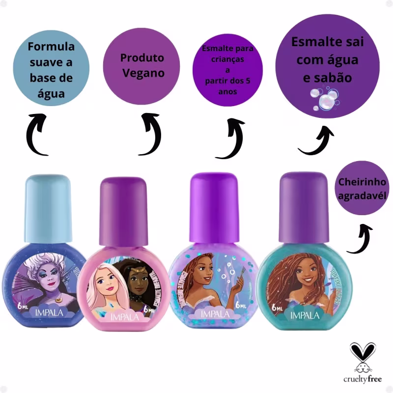 Seja para um dia de brincadeiras ou para uma ocasião especial, o Esmalte Infantil Impala Disney garante unhas lindas, coloridas e cheias de brilho. Com ele, as pequenas podem explorar sua criatividade, sempre inspiradas pelas personagens corajosas e determinadas da Disney. Afinal, cada princesa tem seu próprio conto, e com esse esmalte, sua pequena pode criar o dela!