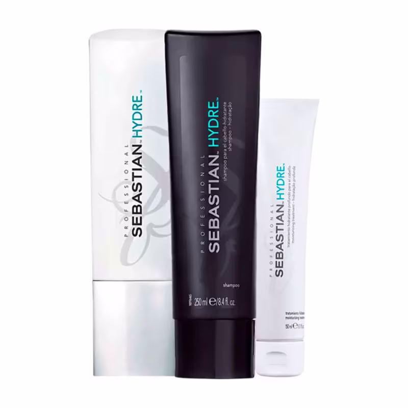 Kit com shampoo, condicionador e máscara para cabelos secos. Sebastian Professional Hydre Power Trio proporciona intensa emoliência e brilho.