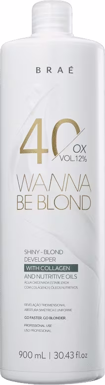 BRAÉ Wanna Be Blond 40 - Água Oxigenada 40 Volumes 900ml: clareia até 4 tons para revelar loiros platinados ou clarear fios escuros naturalmente. Ilumina tons de maneira uniforme e age harmoniosamente com o descolorante Wanna Be Blond. BRAÉ Wanna Be Sua fórmula conta com colágeno que preserva a fibra capilar durante a descoloração, para que não fique muito danificada. Também conta com blend de óleos que deixa os fios macios, com brilho e maleabilidade.
