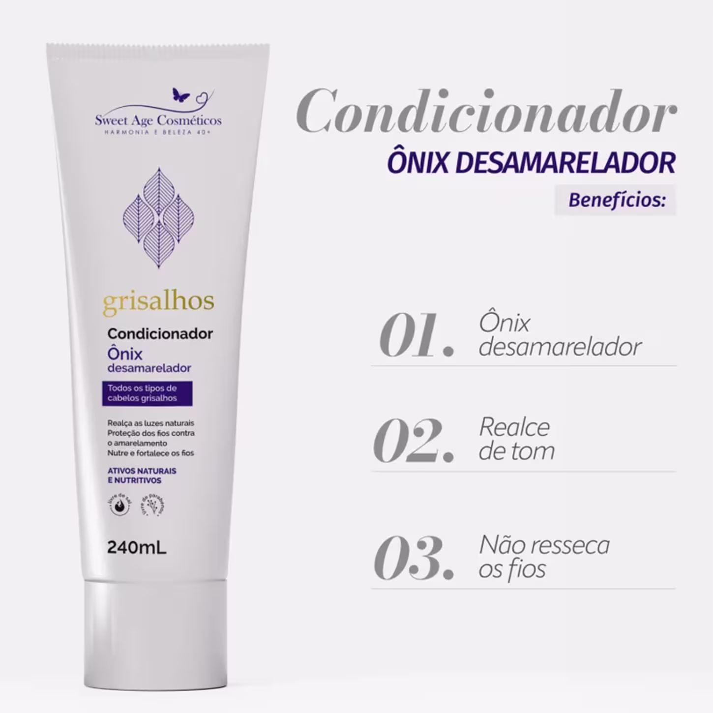 O Condicionador Õnix é o aliado perfeito para quem deseja cuidar dos cabelos grisalhos e cabelos brancos. Com sua fórmula exclusiva de tom acinzentado claro (ONIX), ele foi desenvolvido e rigorosamente testado para realçar a cor dos fios, combater o amarelamento, mantendo a saúde e o brilho natural dos cabelos