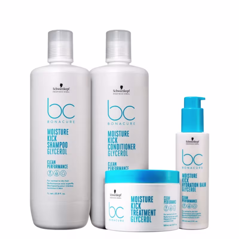 O Kit Schwarzkopf Professional BC Bonacure Clean Performance Moisture Kick Quarteto Hydration apresenta fórmula que ajuda a equilibrar o nível ideal de hidratação dos cabelos sem pesar nos fios. Conta com a ação do Glicerol que proporciona uma sensação de cabelo hidratado por até 48 horas.