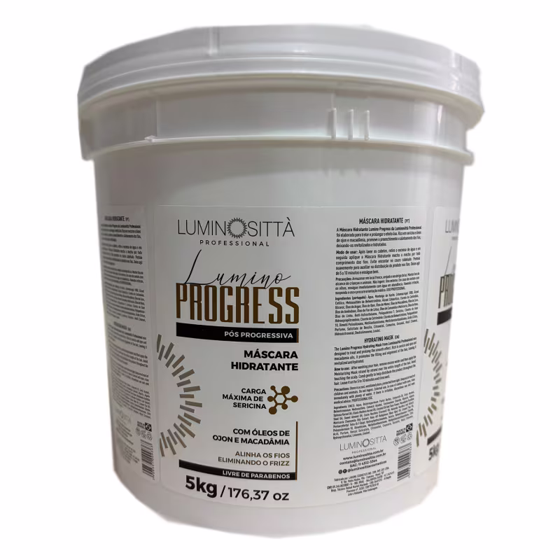A Máscara Lumino Progress 5kg é ideal para complementar o tratamento dos cabelos quimicamente tratados por sua riqueza em ativos nutrientes que irão auxiliar na manutenção dos fios mais saudáveis e no controle de volume a fim de aumentar a durabilidade dos processos químicos de alisamento. Tecnologia Sericina: partículas catiônicas de sericina que repõem a massa proteica e selam as cutículas danificadas. A alta afinidade com a queratina mantém as fibras capilares alinhadas e proporciona um resultado suave e brilhante.