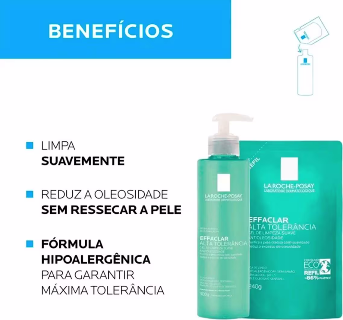 O Gel de Limpeza Facial Effaclar Alta Tolerância possui uma fórmula especialmente desenvolvida para peles oleosas sensíveis ou sensibilizadas, limpa de forma eficaz, reduzindo a oleosidade e o brilho sem irritar a pele.