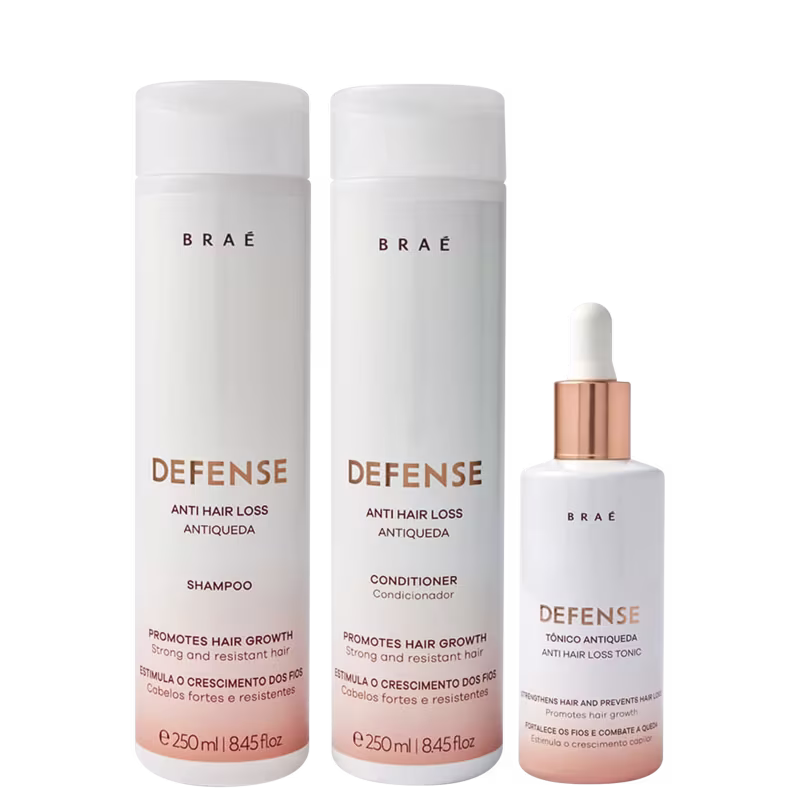 O Tônico Condicionante Defense da BRAÉ possui uma associação de ativos de alta performance, comprovadamente eficazes no tratamento antiqueda. Ele age diretamente no bulbo capilar, estimulando o crescimento dos fios, evitando a queda e regulando as diferentes fases de crescimento dos cabelos. Eficácia antiqueda comprovada com o uso completo da linha.
