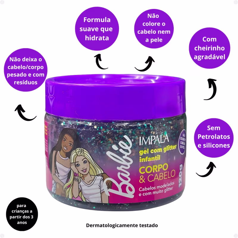 Não sei o CEPTransforme o universo fashionista da Barbie em penteados incríveis com IMPALA Barbie gel fixador glitter corpo & cabelo. Com uma ótima fixação, possui fórmula suave e hidratante que pode ser usada tanto nos cabelos, sem deixá-los pesados ou com residuos, quanto no corpo. E o toque especial? Muito glitter para finalizar o penteado com estilo e brilho de montão.