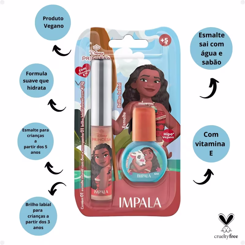 O Kit Esmalte e Brilho Labial Impala foi desenvolvido especialmente para crianças a partir de 5 anos. Ideal para deixar as mãos das crianças muito mais bonitas, cheias de fantasias e com cores pra lá de especiais.