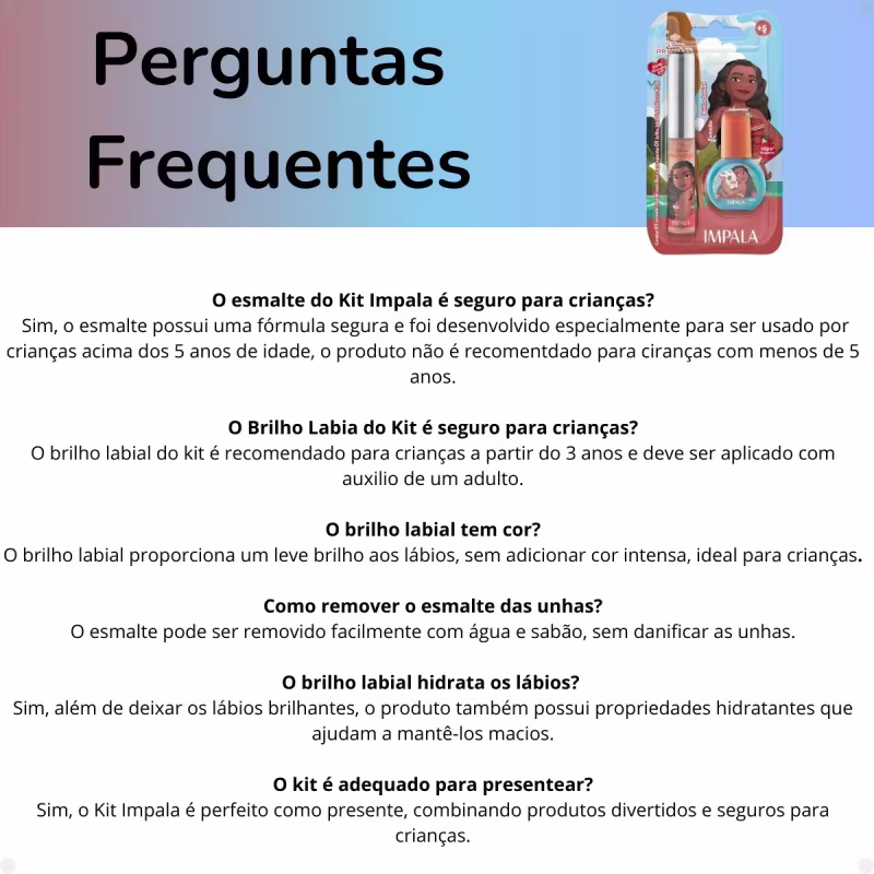 O esmalte do Kit Impala é seguro para crianças? Sim, o esmalte possui uma fórmula segura e foi desenvolvido especialmente para ser usado por crianças acima dos 5 anos de idade, o produto não é recomentdado para ciranças com menos de 5 anos.