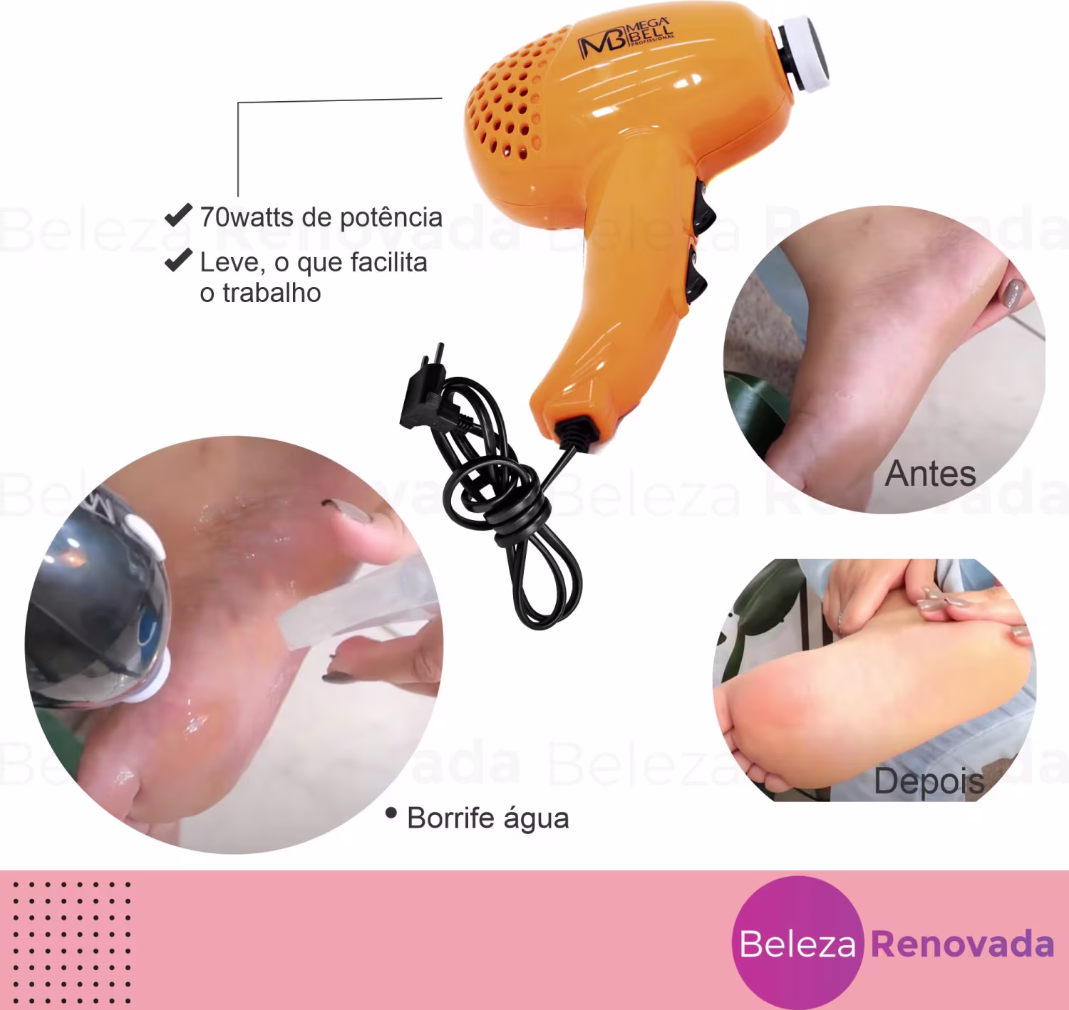 Não sei o CEPO Pedicuro Elétrico Profissional Mega Bell ou a Lixa Elétrica para os Pés Mega Bell é moderno, seguro, compacto e fácil de usar. Indicado para atenuar calos e diminuir a aspereza dos pés, proporcionando maciez e sensação de leveza. Acompanha 12 lixas: 6 finas para acabamento e peles sensíveis, e 6 grossas para retirada de calos e peles ásperas. Ideal para uso profissional, facilitando e refinando o trabalho de beleza.