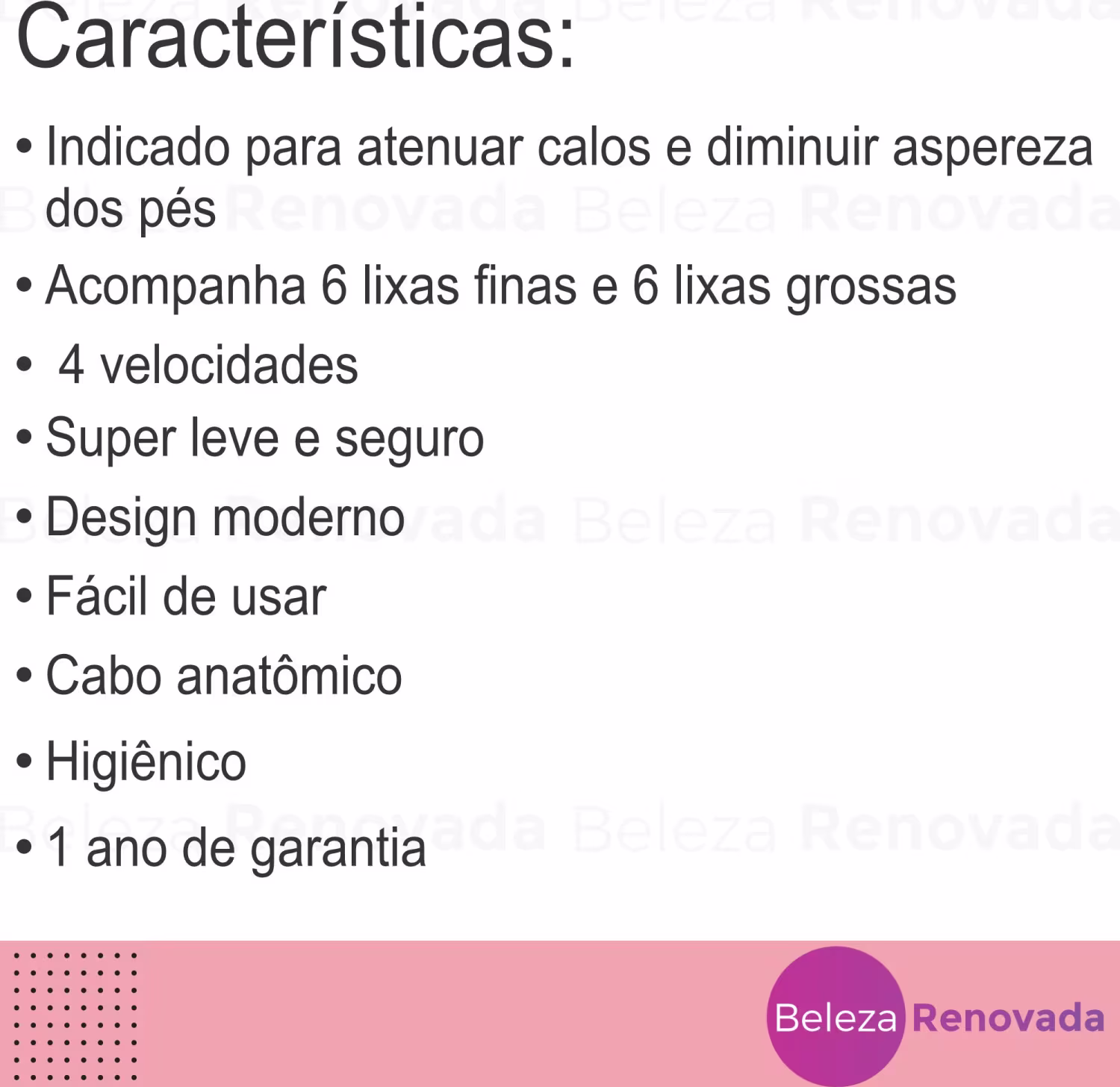 Atributos do ProdutoO Pedicuro profissional possui 4 velocidades, cabo anatômico, design inovador, potente e leve. Acompanha lixas descartáveis, tornando-o higiênico e seguro. Seu design moderno permite melhor utilização em áreas sensíveis com segurança. Voltagem disponível em 110V ou 220V, garantindo versatilidade de uso. Com altura de 20cm, diâmetro de 7,7cm e peso aproximado de 487g, é um equipamento prático e eficiente. Garantia de 1 ano pelo fabricante Mega Bell.