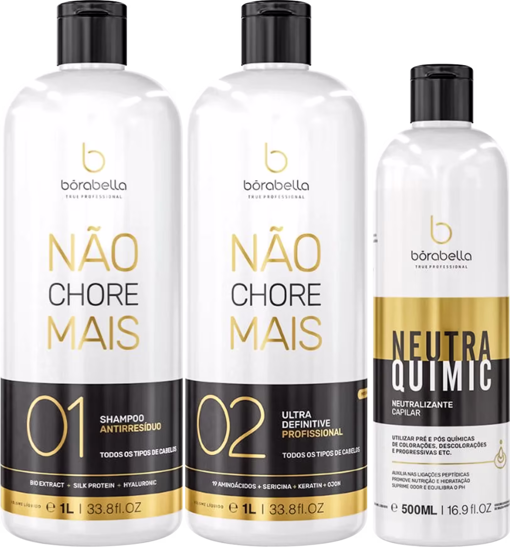 A formulação importada da Borabella Não Chore Mais é composta por ativos avançados e exclusivos que penetram profundamente nos fios, proporcionando uma verdadeira revitalização profissional de salão.