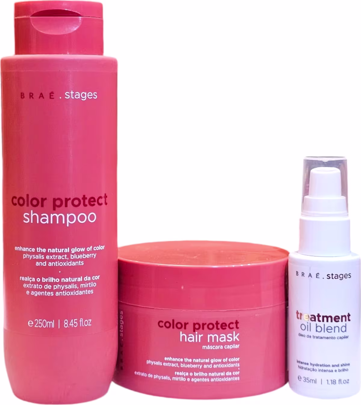 Frequência de uso: Utilize o shampoo diariamente, a máscara 1 a 2 vezes por semana e o óleo conforme a necessidade dos seus cabelos. Personalize: A quantidade de produto pode variar de acordo com o comprimento e a textura dos seus cabelos. Combinação: Para um resultado ainda melhor, utilize o kit completo.Benefícios do Kit Braé Stages Color Protect:
