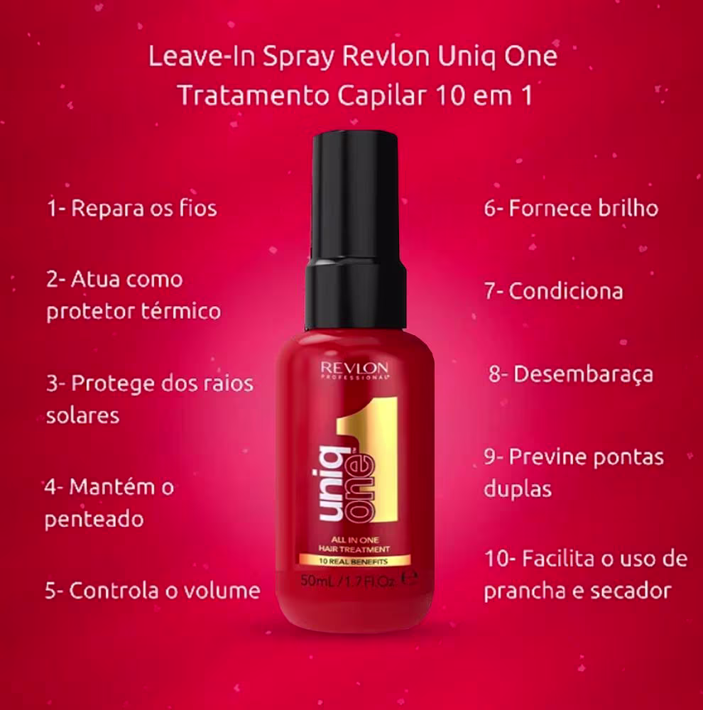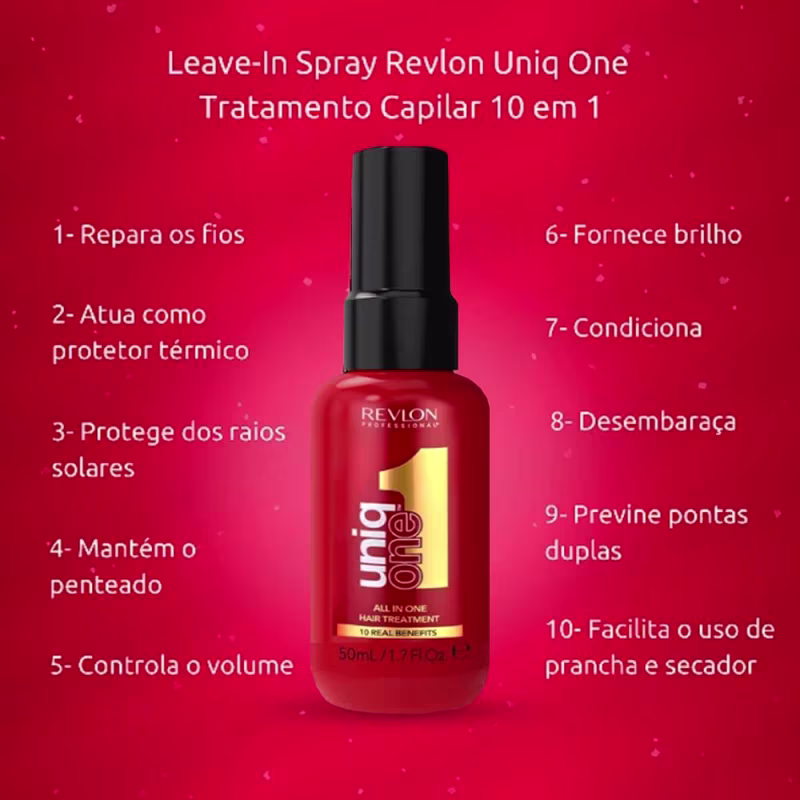 Ocasiões Indicadas10 Benefícios em Um Único Produto : O Uniq One oferece benefícios práticos, como acessórios, proteção térmica, controle de frizz, brilho e desembaraço, tudo em um só frasco.