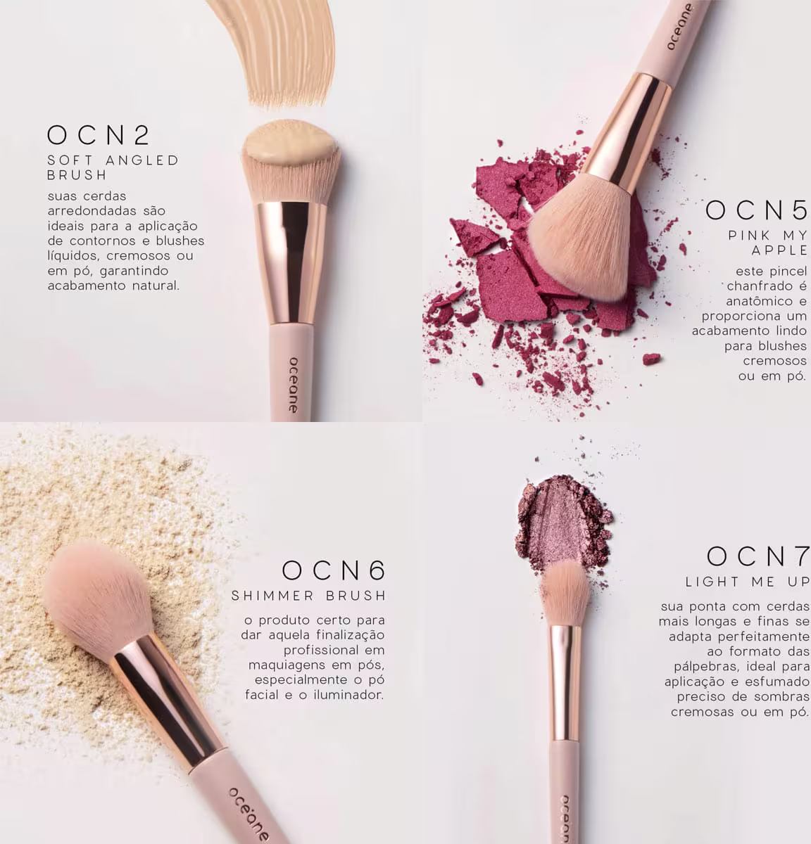 Pincéis: OCN1 - indicado para a aplicação de produtos líquidos e seu formato facilita a aplicação de bases e contornos;