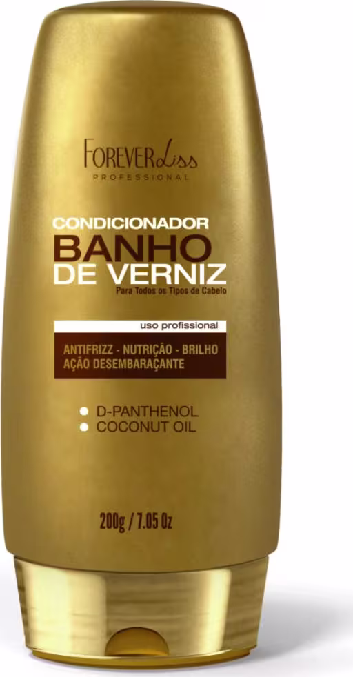 Condicionador Banho De Verniz Forever Liss é enriquecido com D-Pantenol e Óleo de Coco para reparar, nutrir e hidratar profundamente os fios, reduzindo o frizz e promovendo maciez e brilho intenso. Com ação emoliente, ajuda a desembaraçar e selar as cutículas, melhorando a elasticidade e reduzindo a quebra. Indicado para todos os tipos de cabelo, especialmente os ressecados e opacos, ele fortalece e alinha os fios, proporcionando um aspecto saudável e vibrante com o uso contínuo.