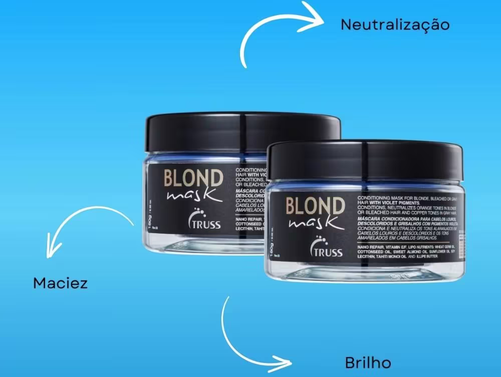 Matização avançadaAlém de revitalizar os cabelos, a Máscara Matizadora Truss Blond Mask conta com a tecnologia inovadora Blend of Violet Pigments, que atua na neutralização dos tons alaranjados em cabelos louros e descoloridos, e nos tons amarelados em cabelos grisalhos, garantindo um resultado matizador excepcional.