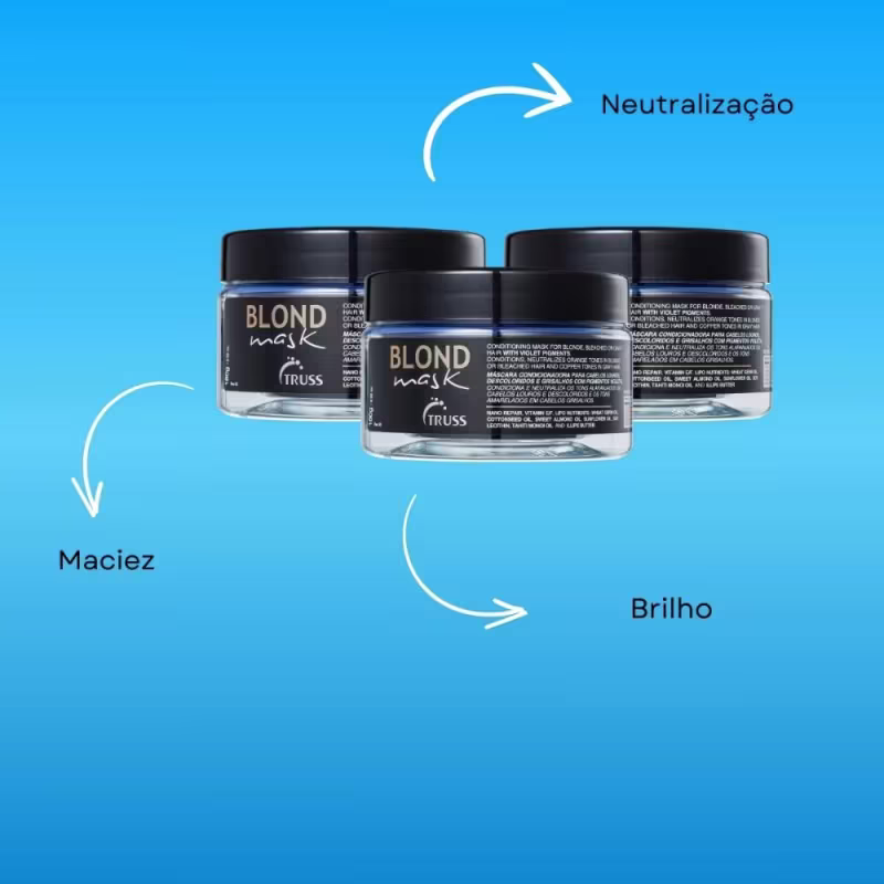 Matização avançadaAlém de revitalizar os cabelos, a Máscara Matizadora Truss Blond Mask conta com a tecnologia inovadora Blend of Violet Pigments, que atua na neutralização dos tons alaranjados em cabelos louros e descoloridos, e nos tons amarelados em cabelos grisalhos, garantindo um resultado matizador excepcional.