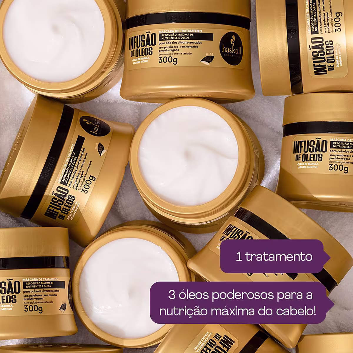 Haskell Infusão de Óleos - Máscara Capilar 500g: tratamento altamente nutritivo, repara profundamente o ressecamento dos cabelos. Desenvolvida para nutrir e restaurar fios severamente secos. Fórmula rica em óleos nobres, repõe os lipídeos e nutrientes perdidos, combatendo o aspecto seco e protegendo os fios contra danos externos. Proporciona hidratação intensa, brilho radiante e uma revitalização completa dos cabelos. Livre de parabenos, sulfatos e petrolatos.