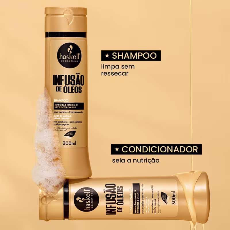 Haskell Infusão de Óleos - Shampoo 500ml: para todos os tipos de cabelo. Promove uma limpeza suave e hidrata os fios de modo especial. Traz em sua formulação a combinação de óleos vegetais que oferecem uma nutrição de alto patamar aos fios. Com fragrância delicada, proporciona um banho relaxante e revigorante. Perfeito para madeixas nutridas, sedosas e com um brilho extraordinário. Livre de parabenos, sulfatos e petrolatos.