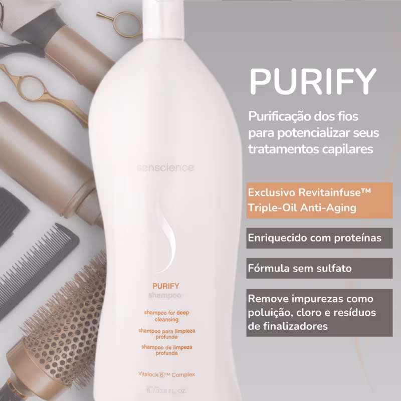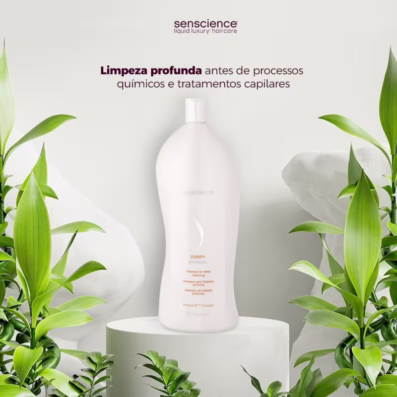 Senscience Purify - Shampoo Antirresíduo 1L (2 unidades): retira o acúmulo de resíduos naturais e de produtos modeladores, acoplados nas escamas do fio, sem danificar o cabelo. Age na fibra capilar, promovendo uma limpeza intensiva. Pode ser utilizado antes de processos químicos, colorações ou reconstruções, para que o produto passado consiga penetrar no fio com maior facilidade.