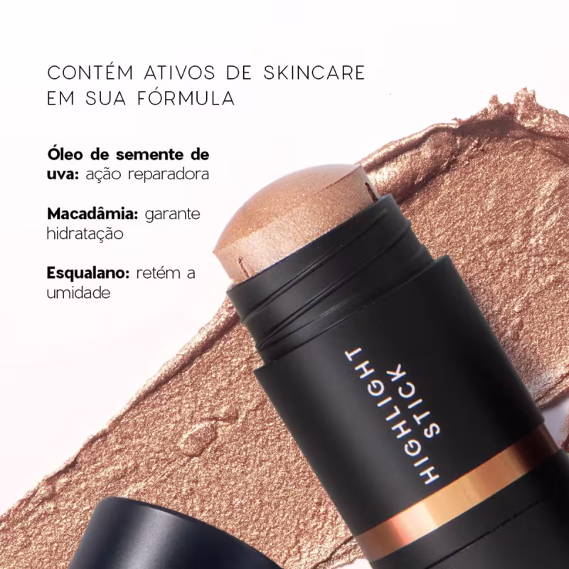 Mini Iluminador: aplique o bastão nas laterais do nariz, abaixo das maçãs do rosto, nas têmporas e na ponta do queixo. Em seguida, esfume bem o produto com um pincel ou esponja para um acabamento natural.