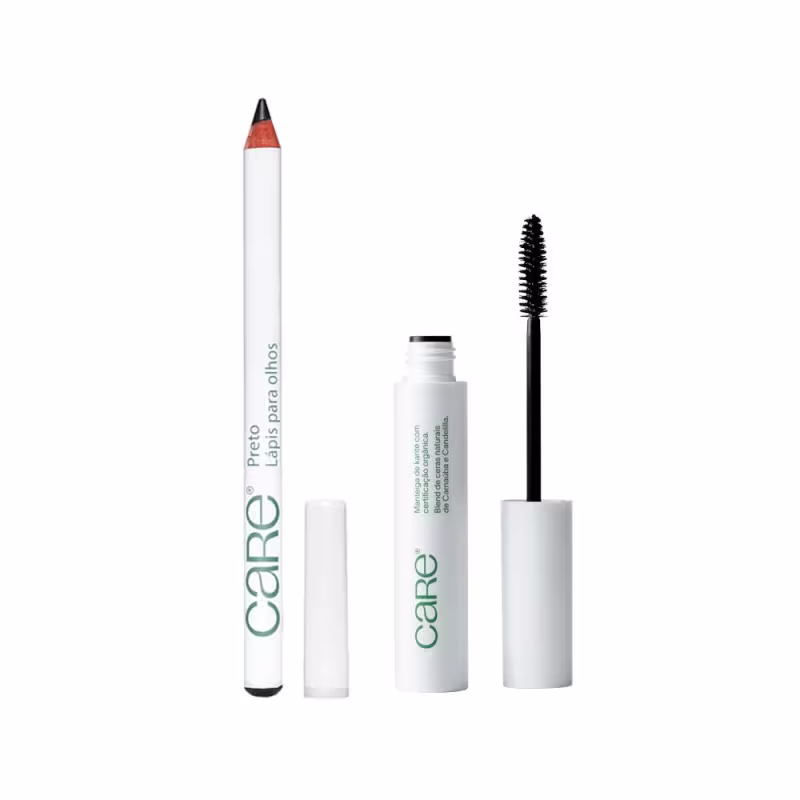 O Kit Maquiagem Para Os Olhos Care Natural Beauty com 2 Produtos, contém 1 Máscara para Cílios Extreme Volume Care Natural Beauty Ultra-Black com 6 gramas e 1 Lápis de Olho Care Natural Beauty Preto com 1,14 gramas.