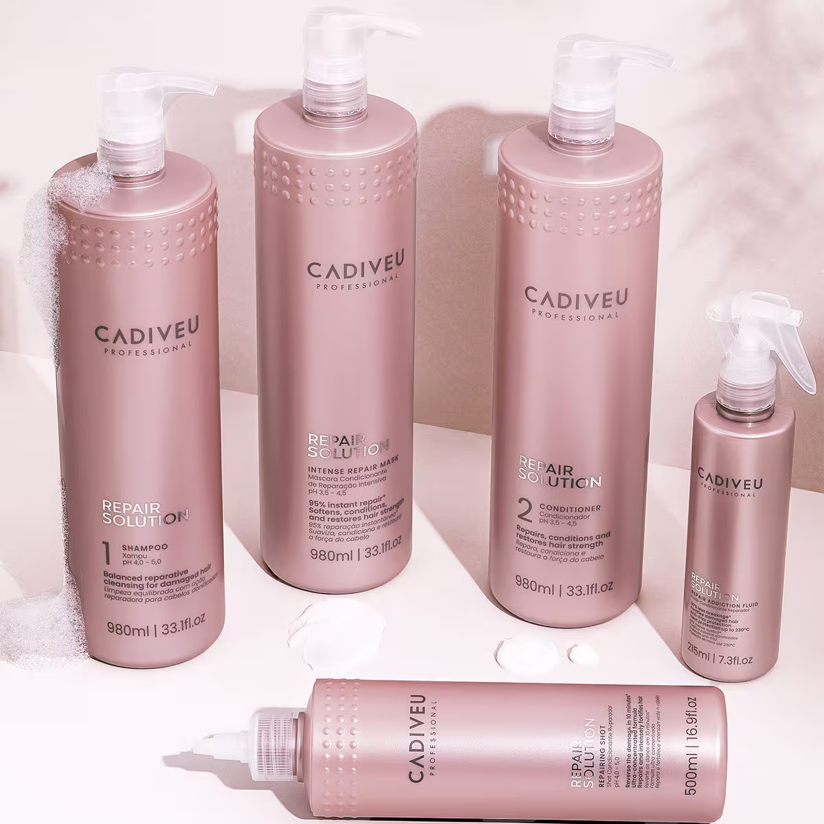 Cadiveu Professional Repair Solution - Shampoo Reparador Sem Sulfato 980ml: oferece uma solução profissional instantânea para cabelos danificados por processos mecânicos, térmicos ou químicos. Um tratamento. Sua formulação garante 95% de reparação instantânea, 90% menos quebra e reversão dos danos em 10 minutos.