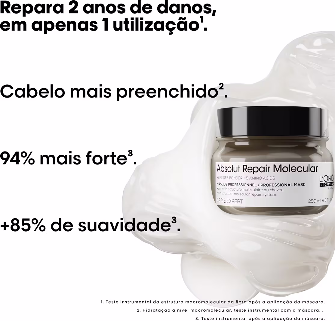 L'Oréal Professionnel Absolut Repair Molecular - Máscara Capilar 250g: para cabelos danificados, repara e reconstrói profundamente a estrutura molecular do cabelo. Com fórmula exclusiva que repara 2 anos de danos a partir da primeira aplicação, tecnologia que decompõe os peptídeos, possibilitando que penetrem na fibra capilar e reconstruam a estrutura molecular do cabelo. Confere fios mais fortes, com elasticidade, movimento e maciez.