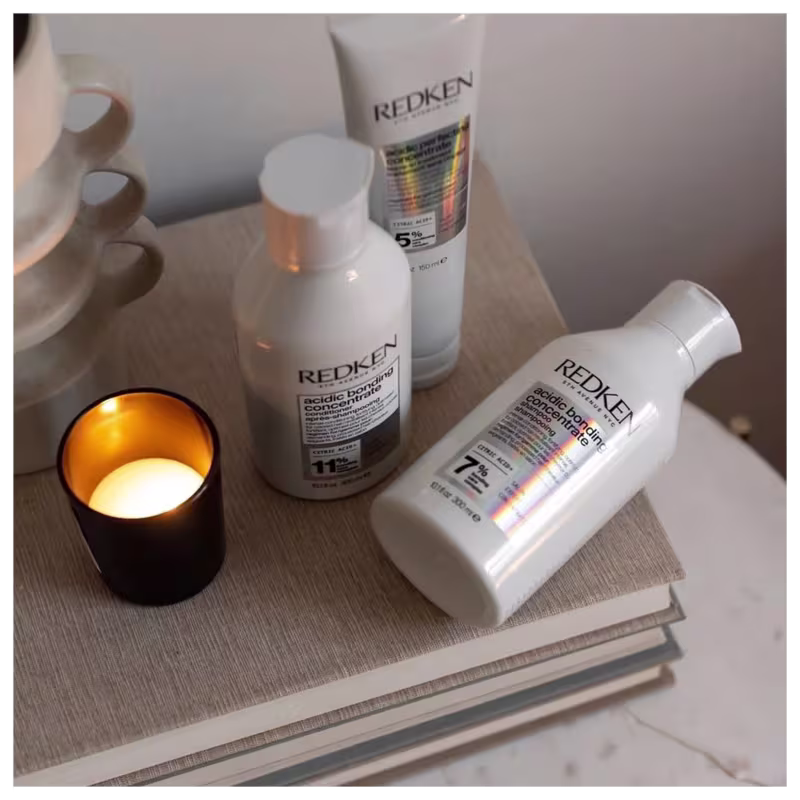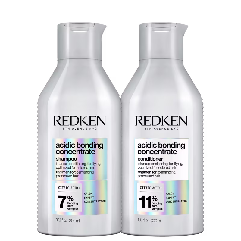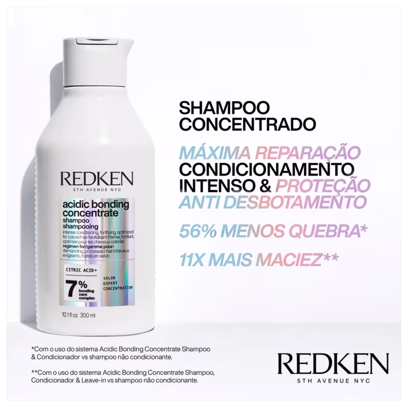 Redken Acidic Bonding Concentrate - Shampoo 300ml (2 unidades): para cabelos secos e danificados. Com alto poder de reparação e proteção da fibra capilar, Redken limpa os fios sem ressecar. Enriquecido com um sistema de reparação concentrado, proporciona força e condicionamento, melhorando a resistência e equilibrando o pH da fibra capilar. Em fios descoloridos, age prevenindo o desbotamento da cor.