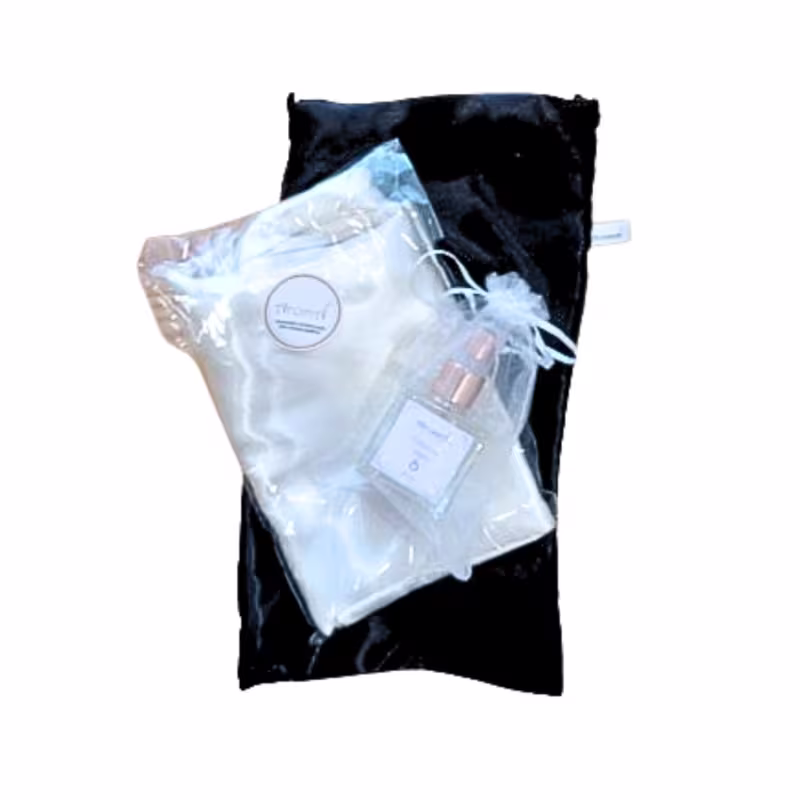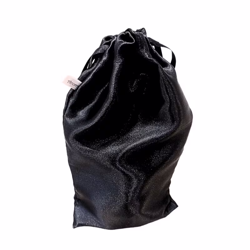 SAQUINHO DE CETIM PRETO mostra atenção aos detalhes do kit, costurado artesanalmente e personalizado com a logo Aromá.