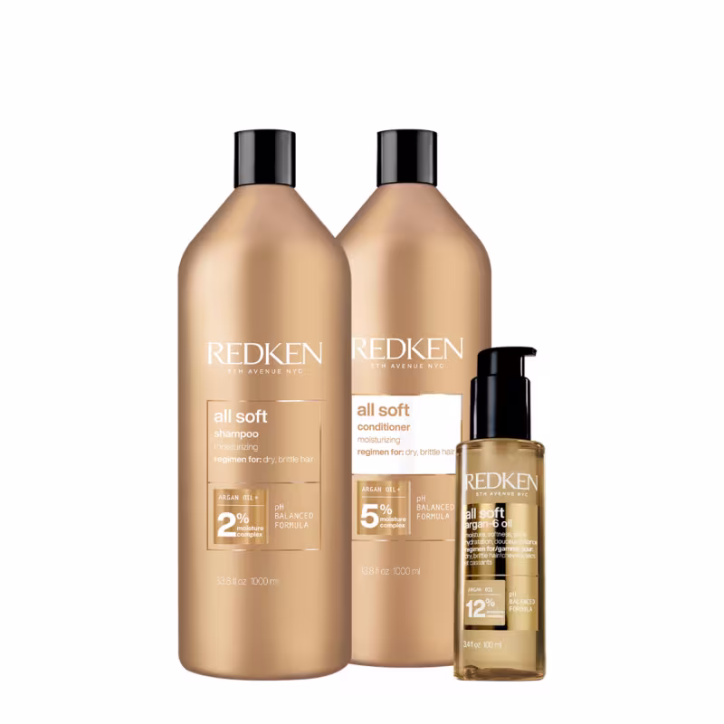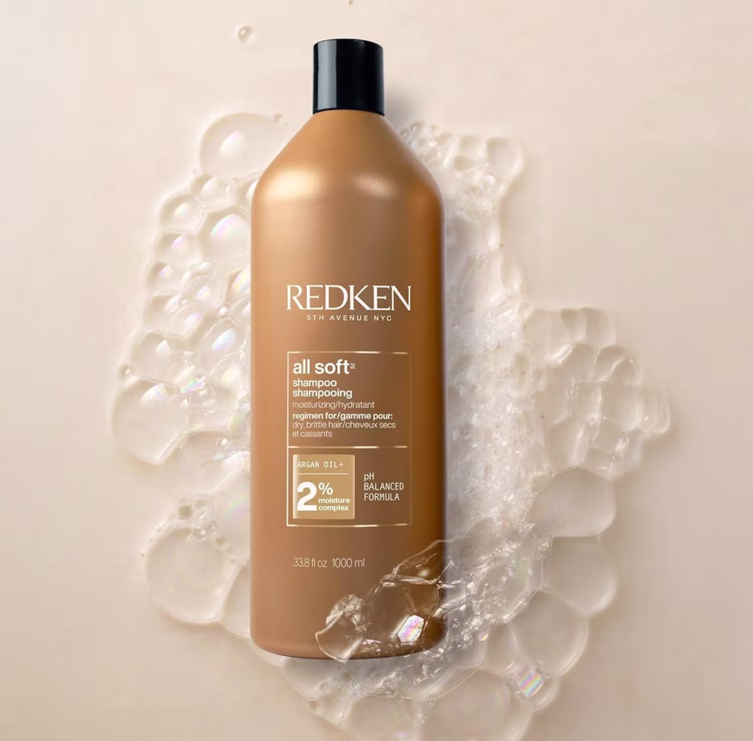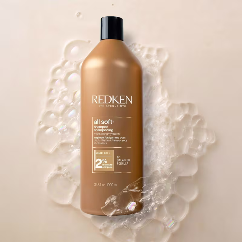 Redken All Soft - Shampoo 1L: para cabelos secos e opacos. Limpa delicadamente e é indicado para deixar os fios hidratados da raiz às pontas. Possui formulação enriquecida com óleo de argan e concentrated moisture complex, que repõe a hidratação, deixando os fios macios e cheios de vida.