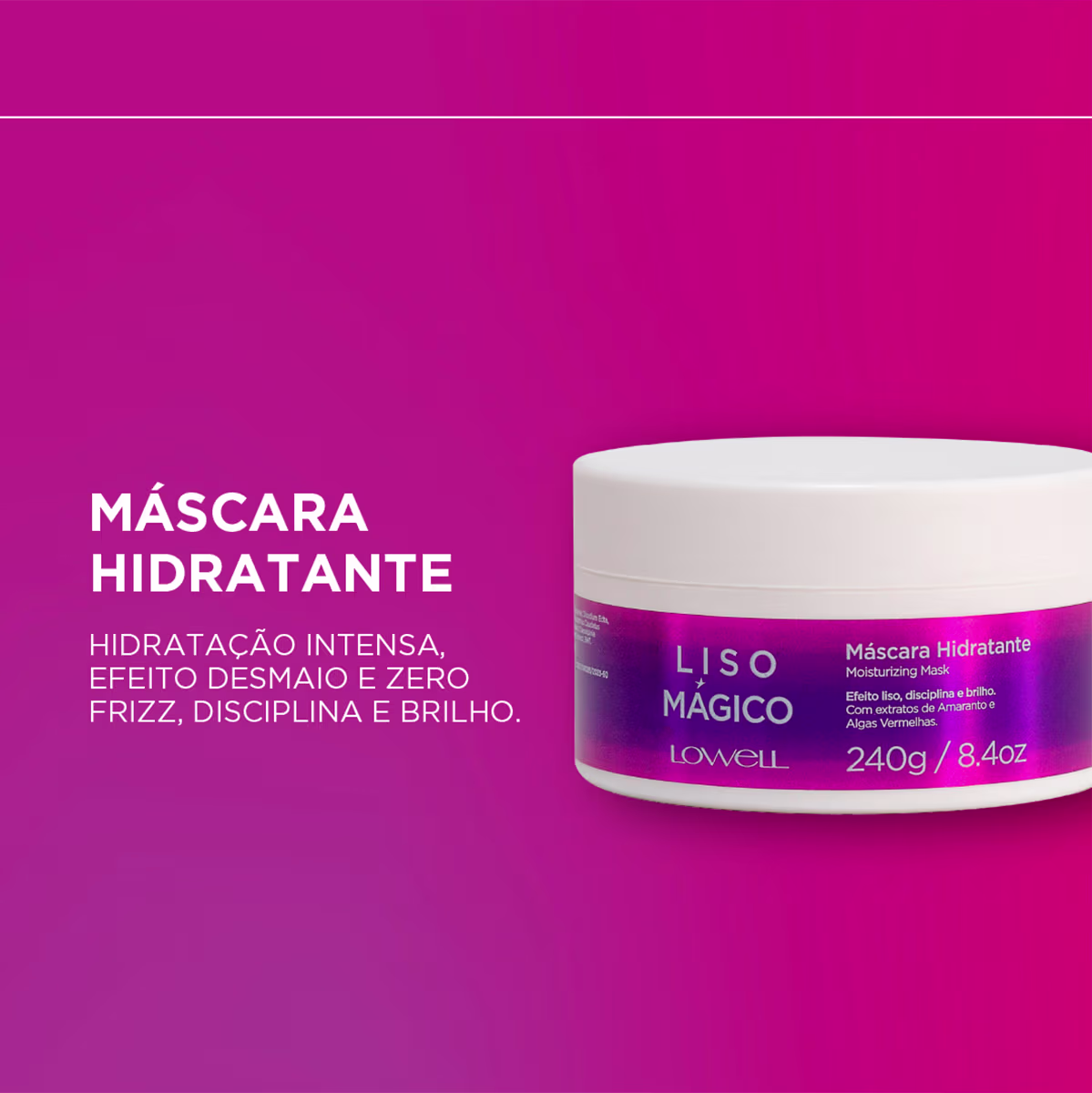 Lowell Liso Mágico - Máscara Capilar 240ml: é a solução perfeita para quem deseja cabelos lisos e brilhantes. Enriquecido com óleo de amaranto e matriz de algas vermelhas, garante um efeito liso sem frizz, auxilia no desembaraço e protege da umidade.