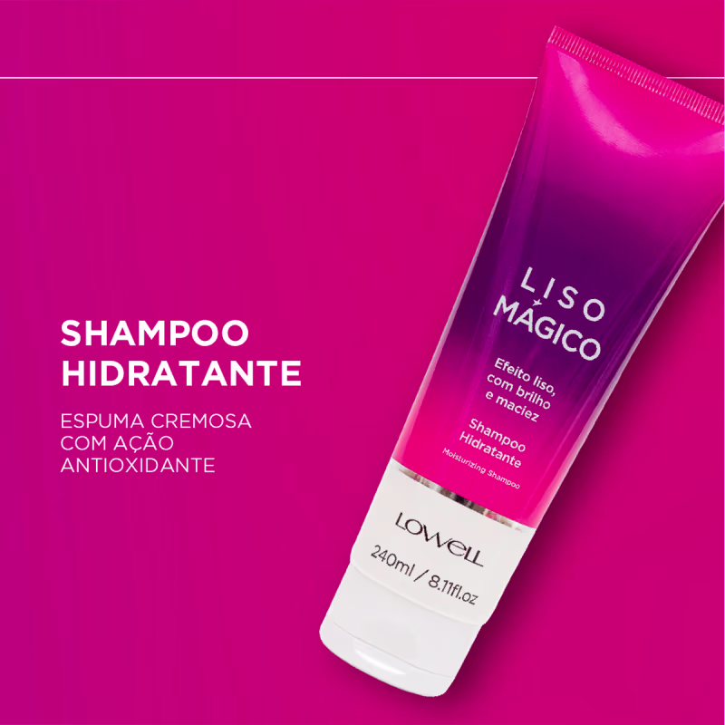 Lowell Liso Mágico - Shampoo 240ml: confere cabelos mais lisos e hidratados, sem agredir os fios. Sua espuma cremosa, limpa profundamente e promove uma textura mais lisa, hidratada e macia ao cabelo. Enriquecido com aminoácidos e polissacarídeos de algas marinhas, prolonga o alisamento dos fios e forma um filme protetor, que sela, remove o frizz, disciplina e oferece brilho.