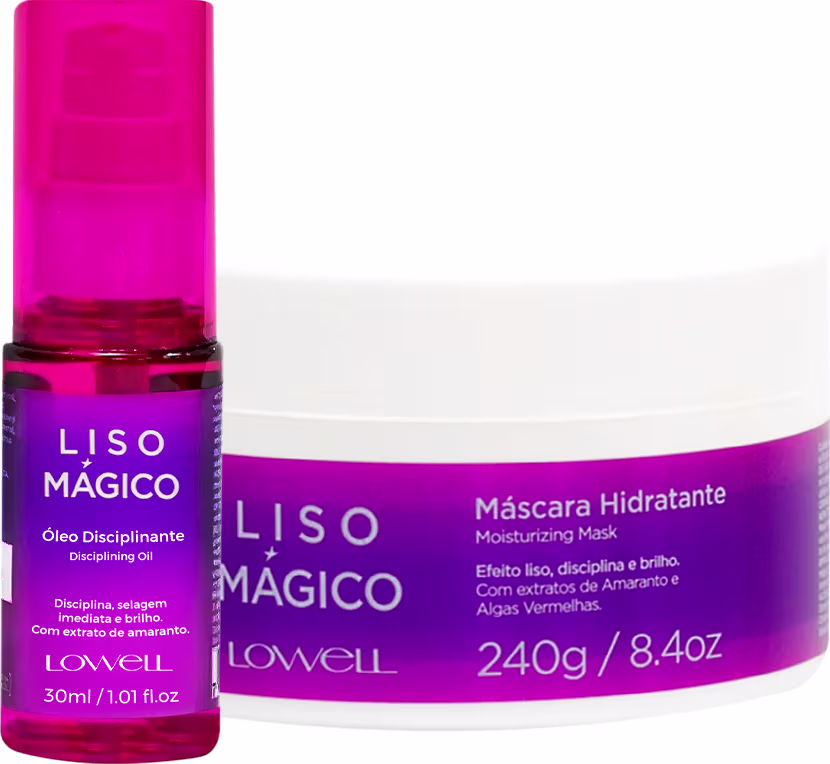 Lowell Liso Mágico - Máscara Capilar 240ml: é a solução perfeita para quem deseja cabelos lisos e brilhantes. Enriquecido com óleo de amaranto e matriz de algas vermelhas, garante um efeito liso sem frizz, auxilia no desembaraço e protege da umidade.