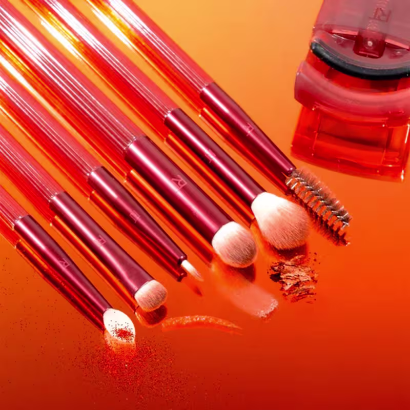 Traz para você 6 pincéis para olhos para aplicação de pigmento e um mini curvex para cílios levantados em movimento.
