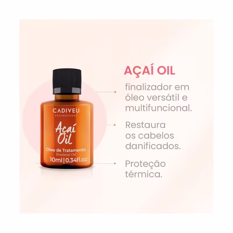 O kit inclui uma Ecobag, além do *Cadiveu Professional Açaí Oil Óleo Capilar de Tratamento (10ml), um óleo capilar enriquecido com açaí, que proporciona nutrição intensa, controle do frizz e brilho radiante aos cabelos.