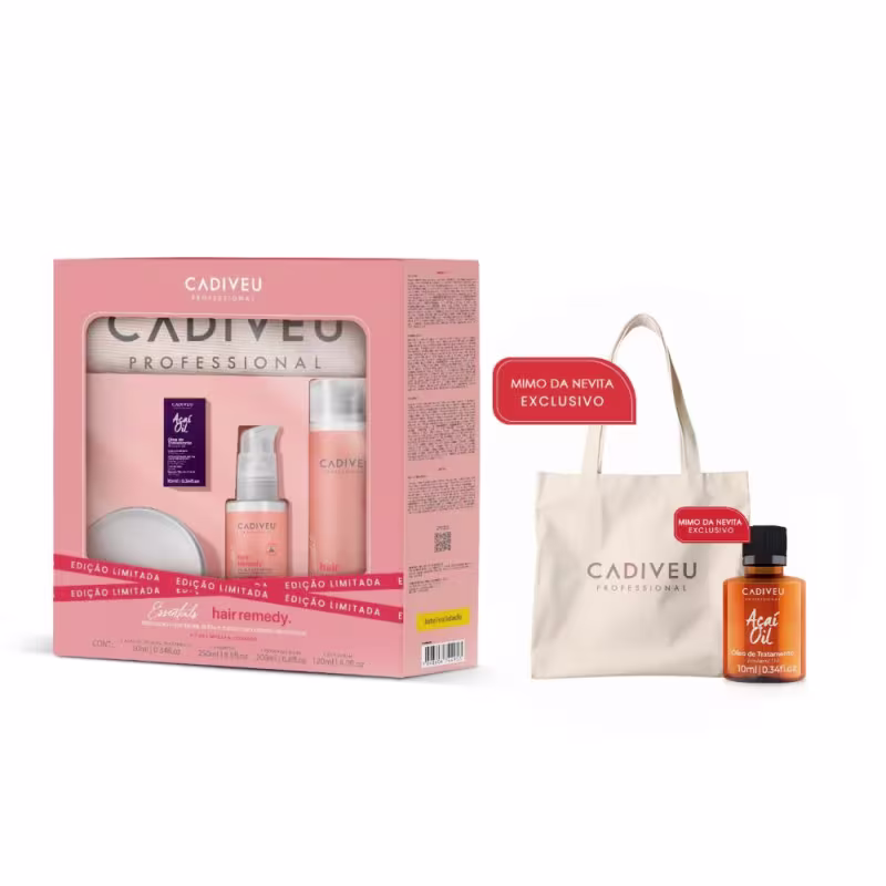 O kit inclui uma Ecobag, além do *Cadiveu Professional Açaí Oil Óleo Capilar de Tratamento (10ml), um óleo capilar enriquecido com açaí, que proporciona nutrição intensa, controle do frizz e brilho radiante aos cabelos.