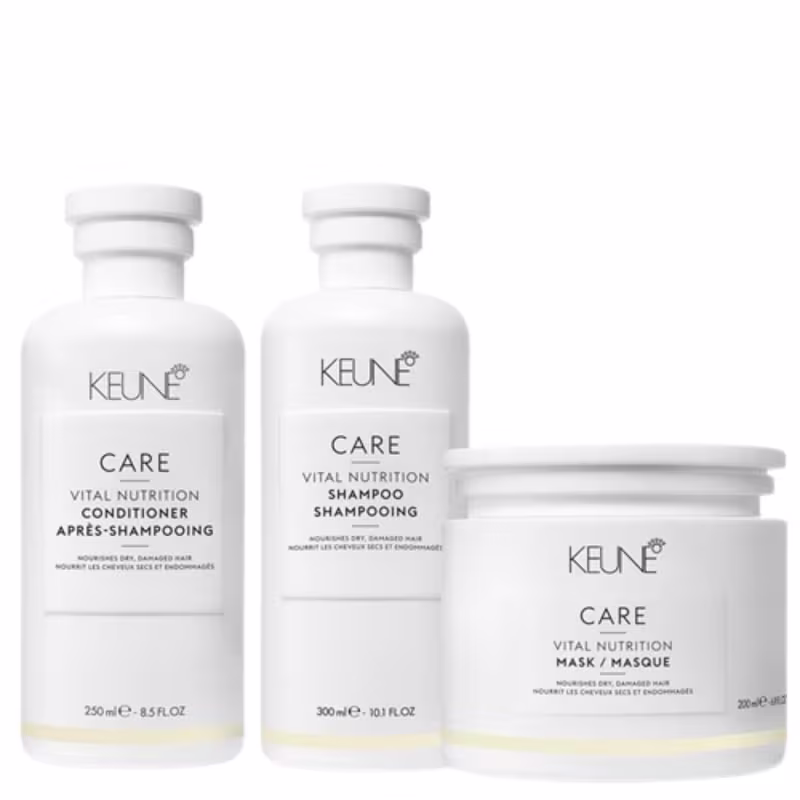 Não sei o CEPKit Keune Care Vital Nutrition Kit com shampoo, condicionador e máscara para cabelos secos e danificados. Keune Care Vital Nutrition Trio limpa, hidrata e revitaliza os fios. O Kit Keune Care Vital Nutrition ajuda a devolver maciez, brilho e vitalidade aos cabelos secos, danificados e porosos, ideal para fios grossos e difíceis de pentear, especialmente após mechas ou descoloração. Sua fórmula contém pró-vitamina B5 que penetra nos fios, hidrata e ajuda a dar mais flexibilidade e vida aos fios. Contém: Keune Care Vital Nutrition - Shampoo 300ml: shampoo para cabelos secos e grossos. Proporciona hidratação e nutrição que devolve a maleabilidade e repara os danos. Keune Care Vital Nutrition - Condicionador 250ml: condicionador para cabelos secos e grossos. Restaura os fios fragilizados com hidratação, brilho e maciez. Keune Care Vital Nutrition - Máscara Capilar 200ml: máscara para cabelos secos e grossos. Penetra nas camadas dos fios para hidratar e reparar os danos.