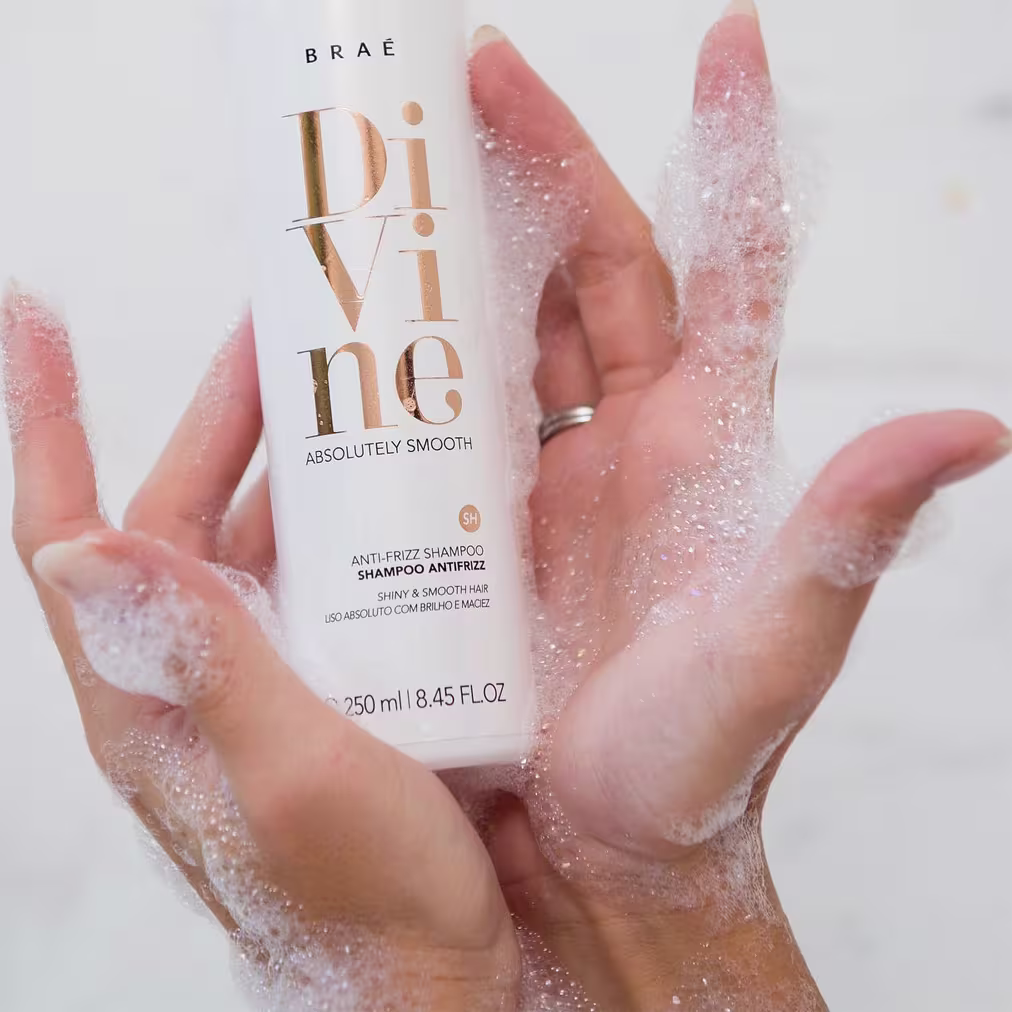 Braé Divine - Shampoo 250ml: deixa os fios mais alinhados e disciplinados durante a limpeza. Seus ativos eliminam o volume e proporcionam um cabelo mais controlado. É perfeito para quem já tem química e deseja manter o efeito liso duradouro.