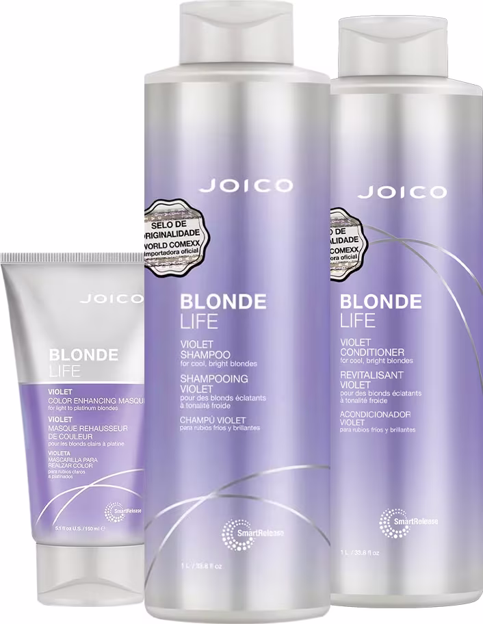Joico Blonde Life Violet Smart Release - Shampoo Matizador 1L: neutraliza os tons amarelados enquanto limpa suavemente os fios para garantir um loiro radiante com uma nuance fria e brilho intenso.