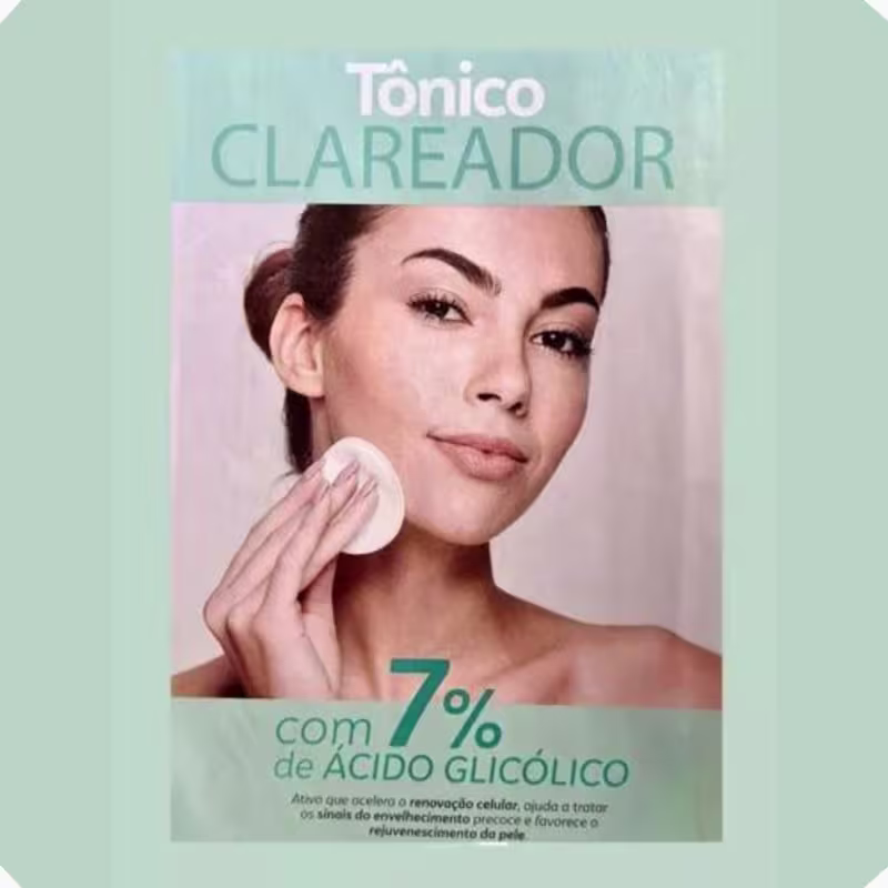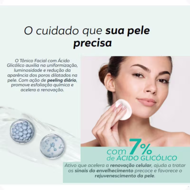 Finalidade: O Tônico Facial com Ácido Glicólico auxilia na uniformização, luminosidade e redução da aparência dos poros dilatados na pele. Com ação de peeling diário, promove esfoliação química e acelera a renovação celular, auxiliando no clareamento e favorecendo o rejuvenescimento da pele.