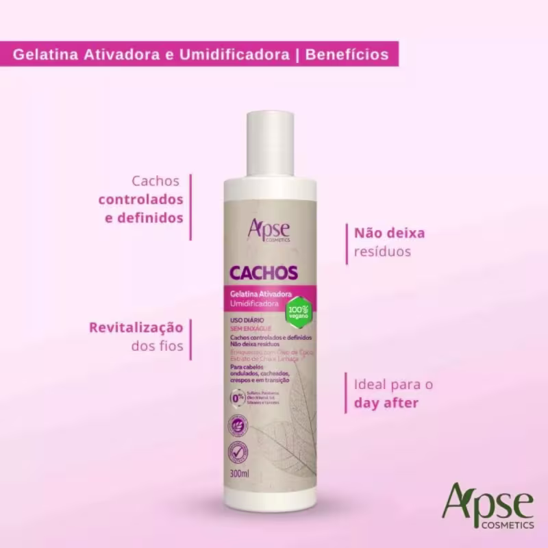 Para o uso em conjunto com o ativador, lembre-se de dosar as quantidades para não pesar os fios, aplique nos cabelos molhados utilizando a técnica de aplicação que preferir. Você também pode utilizar sua gelatina nos fios secos, para uma revitalização dos cachos no seu day after.