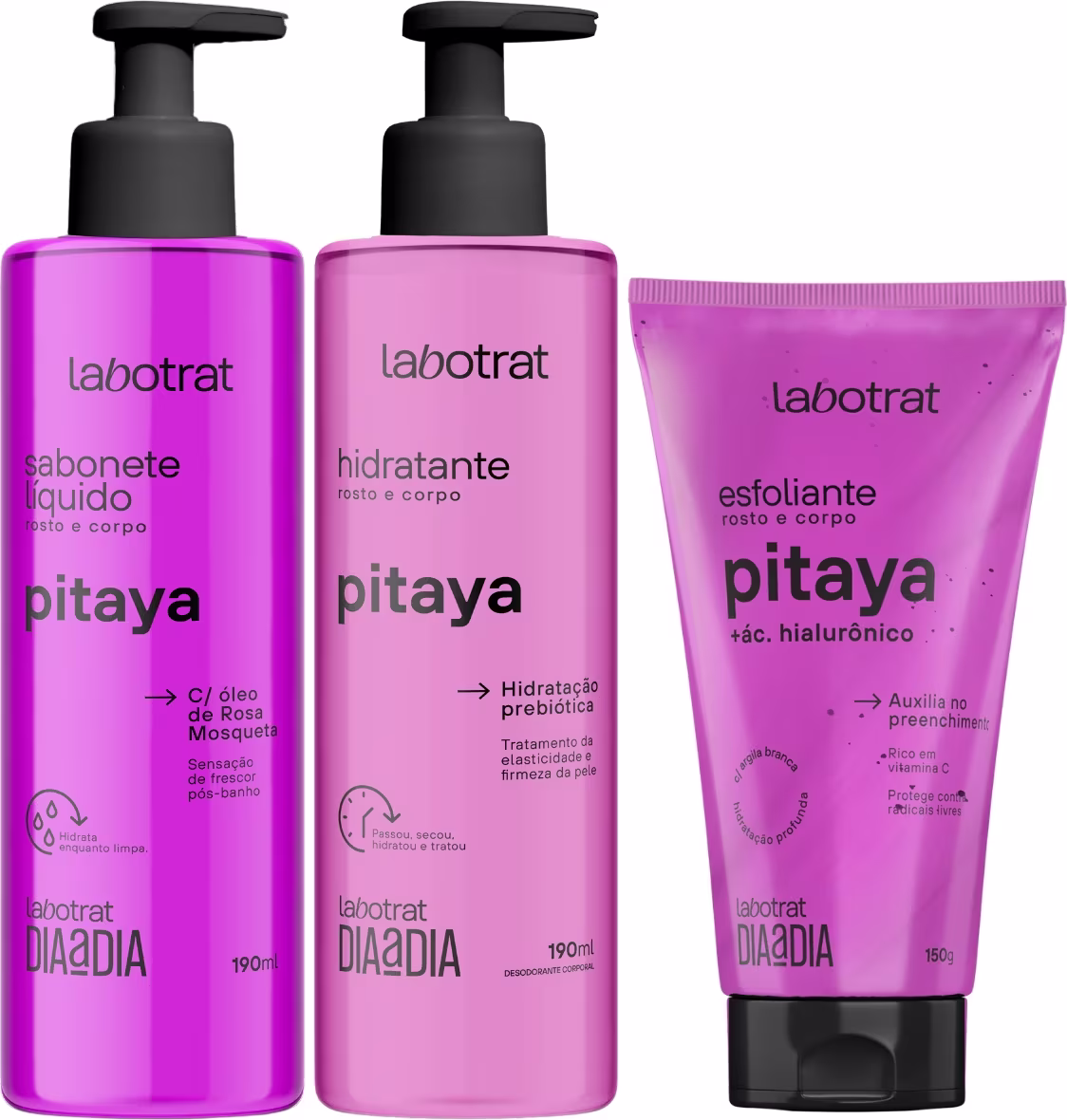 Descubra o Kit Sabonete Hidratante Esfoliante Corporal Pitaya Labotrat, a escolha ideal para quem deseja pele renovada, hidratada e cheia de vitalidade, com um toque de frescor tropical.