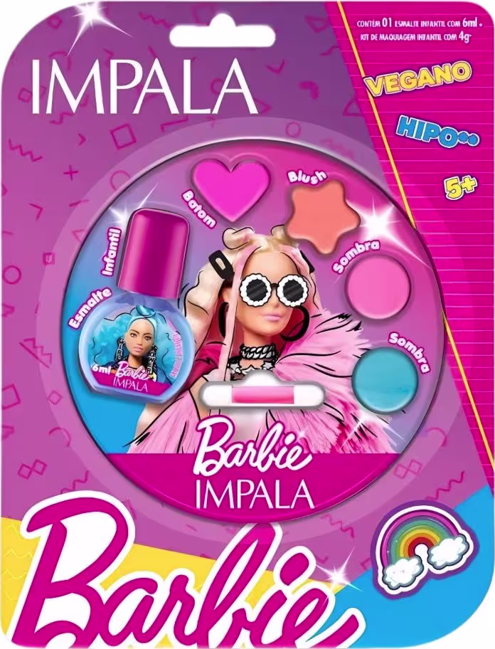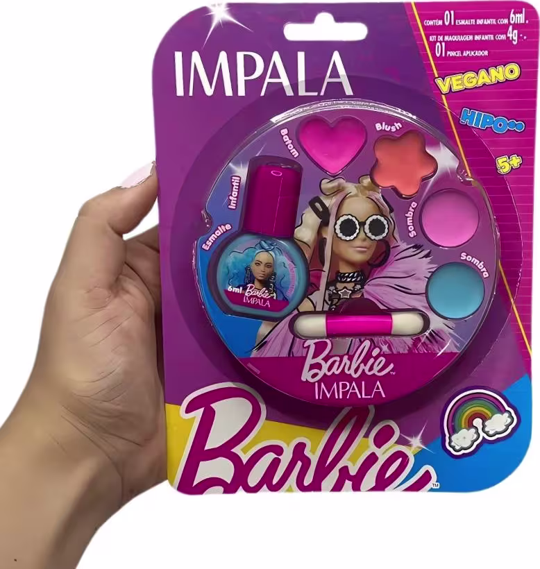 O Kit Impala Barbie Esmalte e Kit de Maquiagem Infantil e Pincel Aplicador foi desenvolvido especialmente para crianças a partir de 3 anos. Cor, atitude e alegria se juntam nessa linda coleção Impala Barbie! São esmaltes e maquiagens com tonalidades lindas e vibrantes para destacar a força e a capacidade das pequenas de serem o que quiserem! A linha foi desenvolvida com a formulação hipoalergênica, dermatologicamente testada, vegana e não testada em animais, à base de água para fácil remoção.