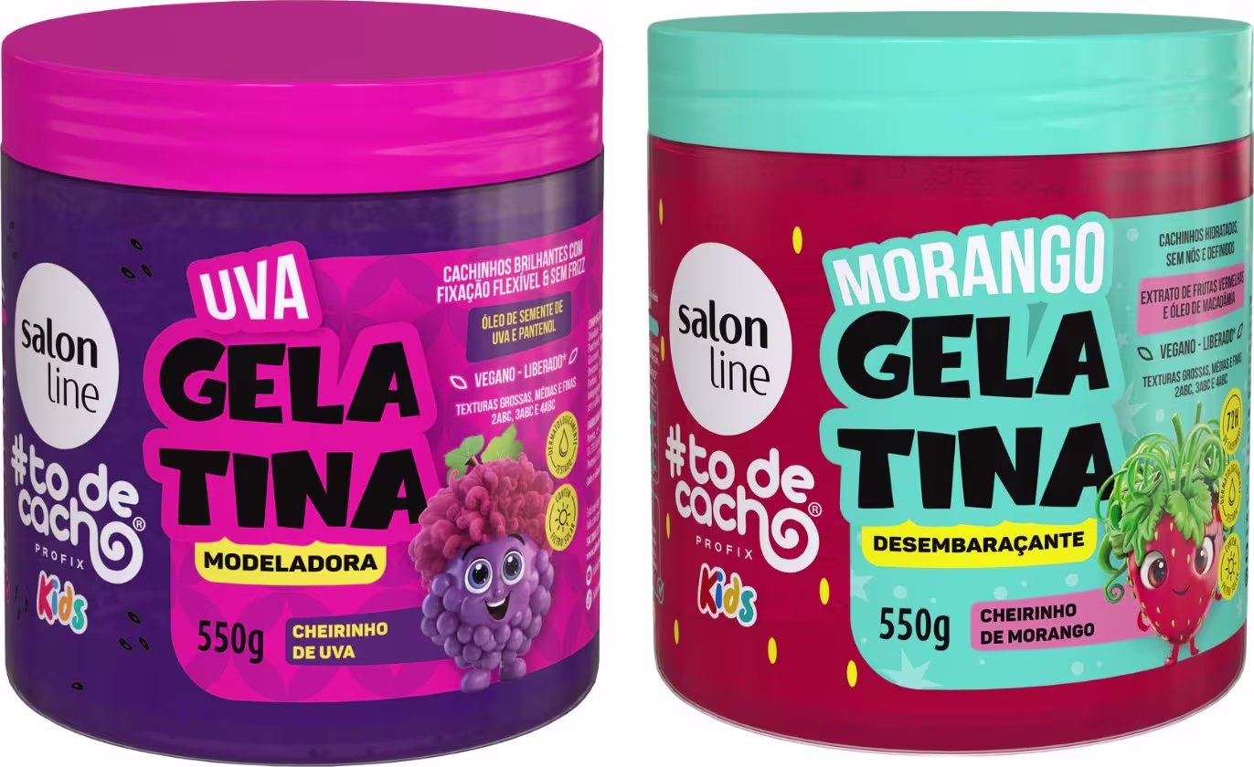 Quer deixar os cachos dos pequenos ainda mais lindos e definidos? O Kit 2 Gelatina Kids Definição Uva Morango Cachos Salon Line é a escolha perfeita para cuidar dos cabelos infantis de forma divertida e eficaz!
