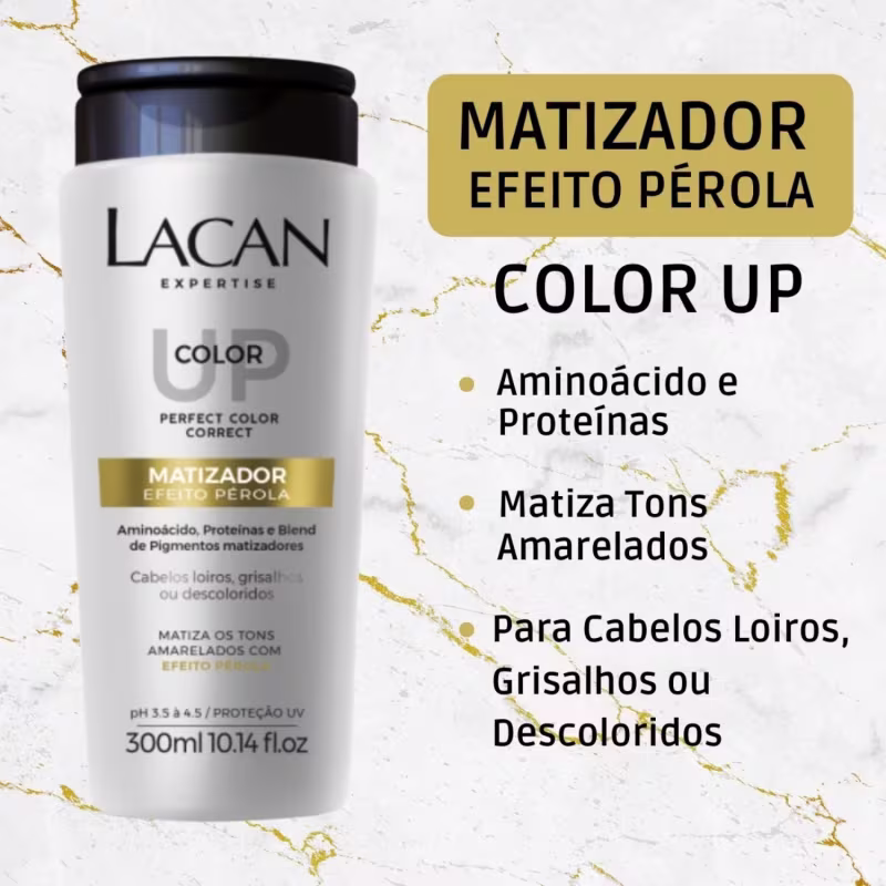 O MATIZADOR COLOR UP LACAN foi desenvolvido com blend de pigmentos exclusivos e complexo de aminoácidos e proteínas hidrolisadas. Juntos matizam, restauram e protegem os fios. Neutralizam os tons amarelos ou alaranjados causados pela ação do tempo, nicotina, poluição, raios UV, processos químicos ou ferramentas de calor. Possui ação reparadora, antioxidante, nutritiva e hidratante. Realça a cor e o brilho, promove sedosidade e reduz a porosidade dos fios.